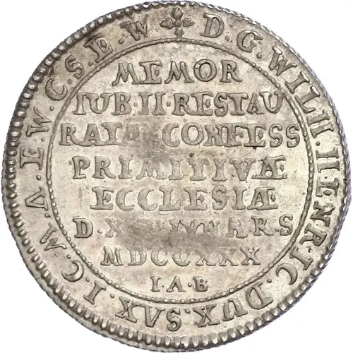 ✤D.G.WILH.HENRIC.DVX.SAX.I.C.M.A.E.W MEMOR IUB·II·RESTAU RATÆ CONFESS PRIMITIVÆ ECCLESIÆ D.XXV.IVN.A.R.S MDCCXXX I·A·B |