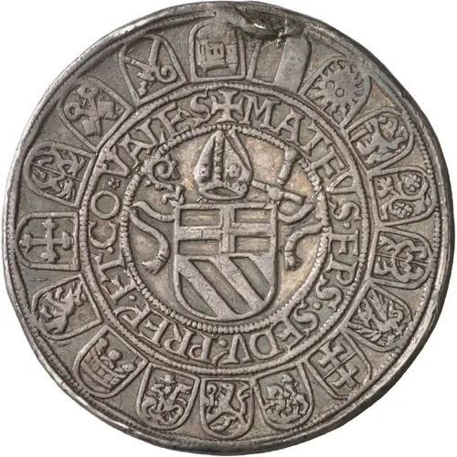 Mitre above shield in inner circle surrounded by legend. Outer circle made of 17 smaller shields |
