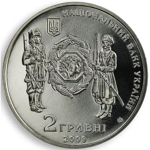 The Small Coat of Arms of Ukraine with the semicircular inscription Національний банк України (National Bank of Ukraine) (above), two military men of the UPR period with a Ukrainian woman`s profile within the Ukrainian wreath, symbolizing the young state, between them, and the legend: 2 ГРИВНІ (2 hryvnias) with the coin issue year 2009 and the logotype of the National Bank of Ukraine Mint (thereunder). |