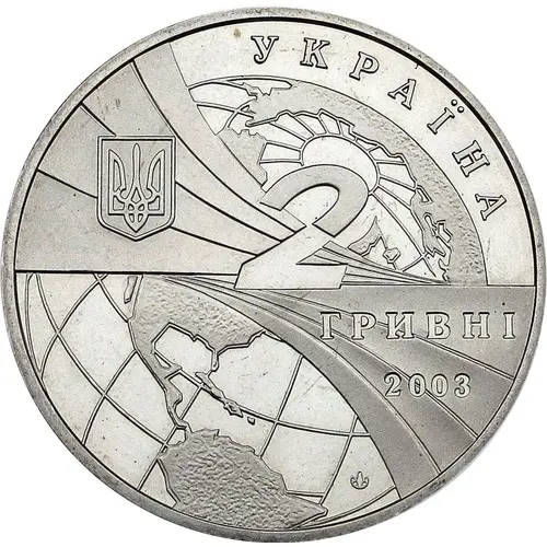Against the background of the a terrestrial globe there is pictured a composition, symbolizing dynamics of air communication, the small National Emblem of Ukraine and the inscriptions: 2 ГРИВНІ, 2003 (2 hryvnia/ 2003). Above and on the right there is a semicircular inscription: УКРАЇНА (Ukraine). Beneath there is the National Bank of Ukraine Mint logotype. |