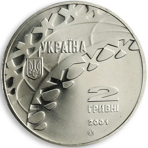 | Obverse description | There is a semicircular conventionalized depiction of a snowflake fragment, upon which there are the inscriptions УКРАЇНА (Ukraine) and the small National Emblem of Ukraine; below and on the right, against the mirror background there are inscriptions: 2 ГРИВНІБ 2001 |