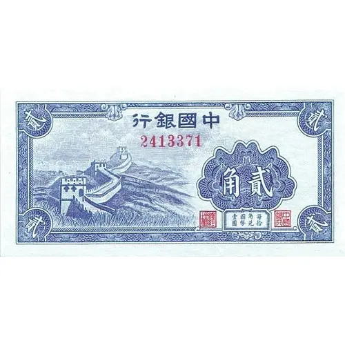 | Obverse lettering | 行银国中 角貳 (Translation: Bank of China Two Jiao) |