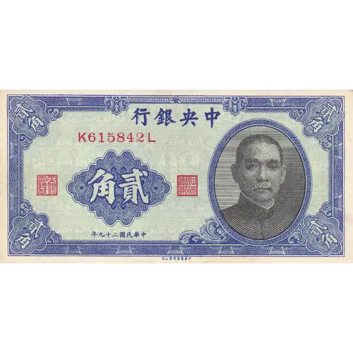 THE CENTRAL BANK OF CHINA TWENTY CENTS 1940 CHUNG HWA BOOK CO. LTD. |