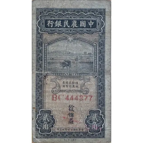 | Obverse lettering | 中國農民銀行 積成拾角兌付國幣壹圓 貳角 中華民國卄四年四月印 中國大業公司 (Translation: The Farmers Bank of China Accumulate 10 Chiao to exchange 1 Yuan national currency 2 Chiao (20 Cents) Printed in April of the Fourth Year of the Republic of China Taye Printing Company) |