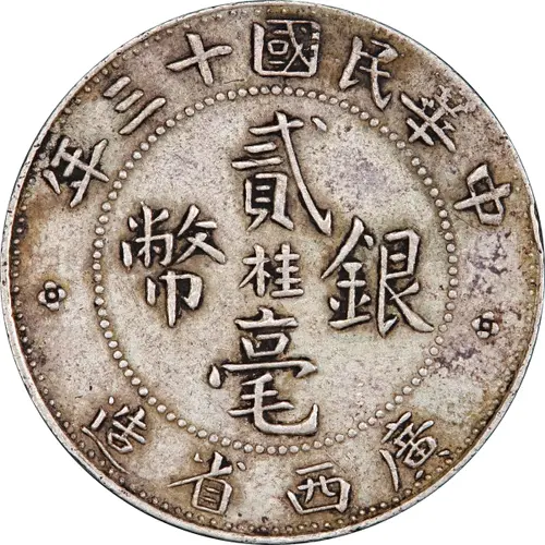 年三十國民華中 貳 幣桂銀 毫 造省西廣 (Translation: Year 8 of the Republic of China 2 Jiao / Silver coin Kuei Made in Kwangsi Province) |