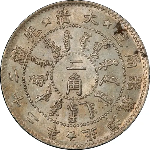 | Obverse lettering | 清大 造局器械洋北 - 年二十二绪光 ᡩᠠᡳᠴᡳᠩ ᡤᡠᡵᡠᠨ ᡳ᠋ ᠪᠠᡩᠠᡵᠠᠩᡤᠠ ᡩᠣᡵᠣ ᡳ᠋ ᠣᡵᡳᠨ ᠵᡠᠸᡝᠴᡳ ᠠᠨᡳᠶᠠ ᠠᠮᠠᡵᡤᡳ ᠨᠠᠮᡠ ᡳ᠋ ᡨᡝᡨᡠᠨ ᡧᡠᡵᡩᡝᡵᡝ ᡴᡡᠸᠠᡵᠠᠨ ᠸᡝᡳᡵᡝᡥᡝ 二 角 (Translation: Great Qing Bei Yang Arsenal Mint / Year 22 of Guangxu Great Qing / Made in Year 22 of Guangxu by the Bei Yang Aresnal Mint 2 Jiao) |