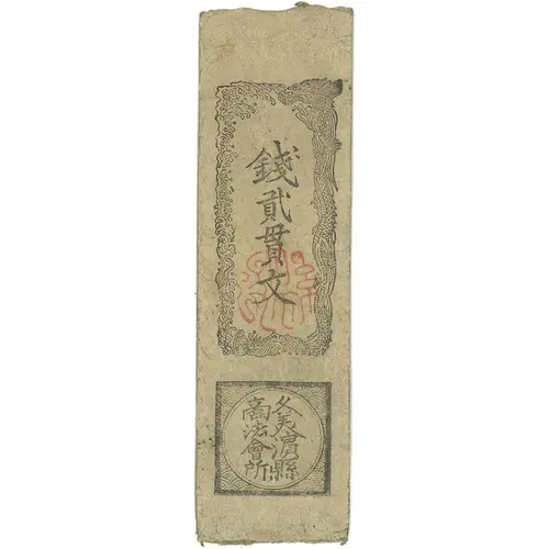 錢貮貫文 (役?)縣 久美濵縣 商法會所 (Translation: Cash Two Kan Mon Prefecture ? Kumihama Prefecture Commerce Office) |