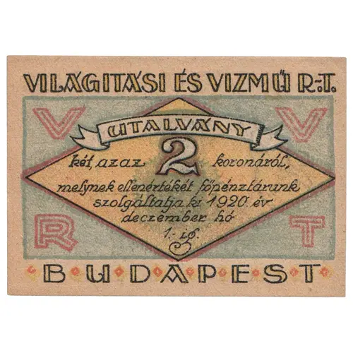 | Obverse lettering | VILÁGÍTÁSI ÉS VÍZMŰ R.T. UTALVÁNY két, azaz 2 koronáról, melynek ellenértékét főpénztárunk szolgáltatja ki 1920. év deczember hó 1.-ig BUDAPEST (Translation: Lighting and Water Utilities Inc. Payment Order about 2 korona, which will be payed in our main cash register till the 1st of December, 1920 BUDAPEST) |