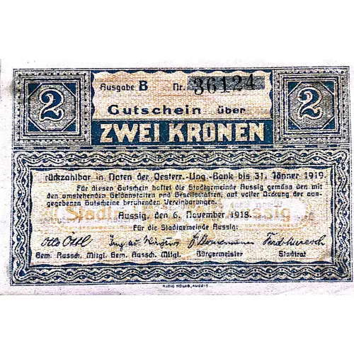 Gutschein über zwei Kronen rückzahlbar in Noten der Oesterr.-Ung.-Bank bis 31. Jänner 1919 [...] Aussig, den 6. November 1918. ALOIS HOLUB AUSSIG (Translation: Voucher for two crowns repayable in banknotes of the Austro-Hungarian Bank until January 31, 1919 [...] Aussig (Ústí nad Labem), November 6, 1918.) |