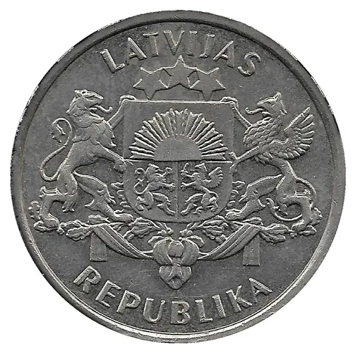 | Beschrijving voorzijde | The large coat of arms of the Republic of Latvia is placed in the centre. The inscription LATVIJAS and REPUBLIKA, each arranged in a semicircle, are above and beneath the central motif, respectively. |