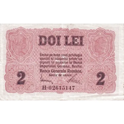 DOI LEI Emise pe baza unui privilegiu special si acoperite printr-un deposit in numerar la Banca Imperiului German, Berlin Banca Generala Romana Sectia de emisie 2 LEI 2 LEI (Translation: TWO LEI Issued on the basis of a special privilege and covered through a cash deposit at the Bank of the German Empire, Berlin Romanian General Bank Department of issue: 2 LEI 2 LEI) |