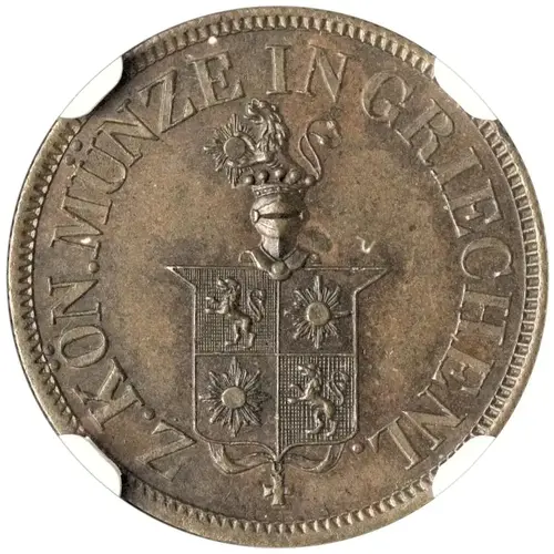 Technical/Grading: Struck in copper, at 2.72 grams and 18 mm, this pattern offers insights into early minting trials. Key high-points for grading include the intricate details of the royal crown, the serifs and flourishes of King Otto's cypher, and the individual leaves within the reverse wreath. As a pattern, strike quality can vary; some examples exhibit sharp, full details, while others may show slight weakness, particularly on the highest relief elements. Planchet quality and evenness of strike are important indicators of its technical execution.