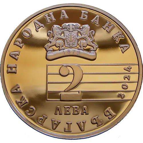 | Obverse description | The obverse of the coin features: the BNB logo with the year ‘1879’ on the strip on the top, and underneath: the nominal value ‘2 ЛЕВА’ (2 levs) is written on a stave in two rows, and in circumference: the inscription ‘БЪЛГАРСКА НАРОДНА БАНКА’ (Bulgarian National Bank) and the year of issue ‘2024’. |