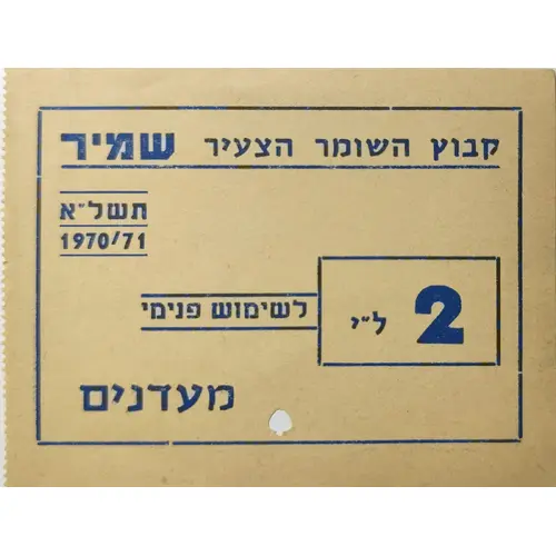 | نوشتههای روی اسکناس | קבוץ השומר הצעיר שמיר תשל`א 1970/71 2 ל`י. לשימוש פנימי מעדנים (Translation: Kibbutz HaShomer HaTzair Shamir, 2 Israeli Liras, for internal use, Ma`adanim) |