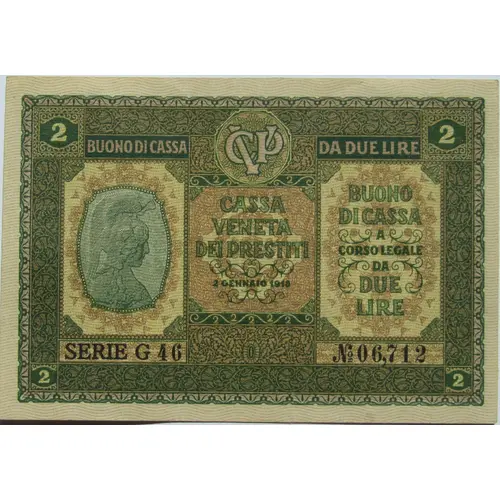 | Obverse lettering | BUONO DI CASSA DA DUE LIRE CASSA VENETA DEI PRESTITI 2 GENNAIO 1918 BUONO DI CASSA A CORSO LEGALE DA DUE LIRE (Translation: TWO LIRE CASH VOUCHER VENETIAN BANK FOR LOANS 2 JANUARY 1918 LEGAL TENDER CASH NOTE FOR TWO LIRE) |