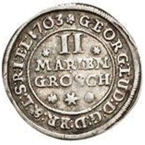 GEORG:LUD:D:G:D:BR:&L:S:R:I:EL 1703 II MARIEN GROSCH (Translation: George Louis by the Grace of God Duke of Brunswick and Lüneburg, Arch Treasurer and Prince Elector of the Holy Roman Empire) |