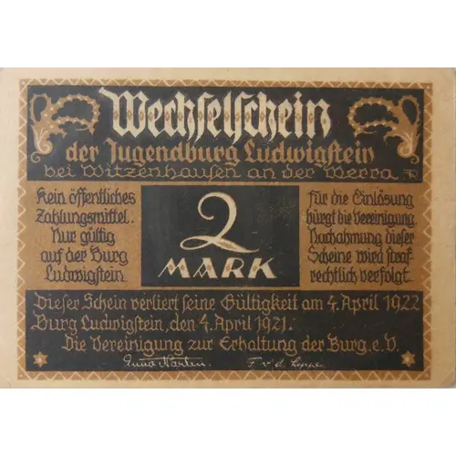 Wechselschein der Jugendburg Ludwigstein bei Witzenhausen an der Werra. Kein öffentliches Zahlungsmittel. Nur gültig auf der Burg Ludwigstein. 2 Mark Für die Einlösung bürgt die Vereinigung. Nachahmung dieser Scheine wird strafrechtlich verfolgt. Dieser Schein verliert seine Gültigkeit am 4. April 1922 Burg Ludwigstein, den 4. April 1921. Die Vereinigung zur Erhaltung der Burg e.V. (Translation: Exchange note of the Youth Castle Ludwigstein near Witzenhausen at the Werra. No public money. Only valid at Ludwigstein Castle. 2 marks The association vouches for redemption. Imitation of these notes will be prosecuted. This certificate expires on April 4, 1922 Ludwigstein Castle, April 4, 1921 The Association for the Conservation of the Castle e.V.) |