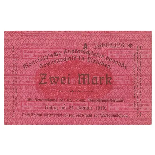 Obverse lettering Mansfeld `sche kupferschiefer bauende gewerkschaft in eisleben zwei mark gultig bis 31 januar 1919