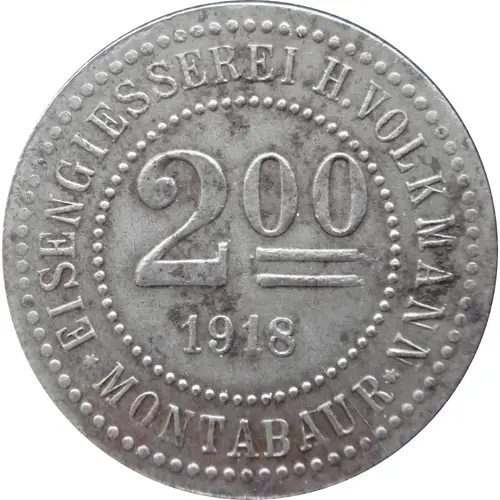 | Obverse lettering | EISENGIESSEREI H. VOLKMANN 2°° 1918 ✶ MONTABAUR ✶ |