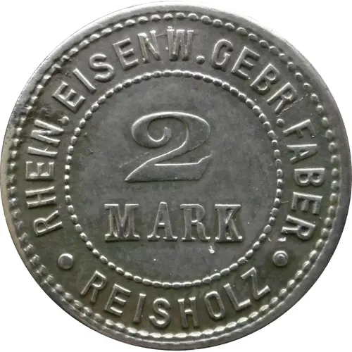 | Legenda del dritto | RHEIN. EISENW. GEBR. FABER 2 MARK ● REISHOLZ ● |