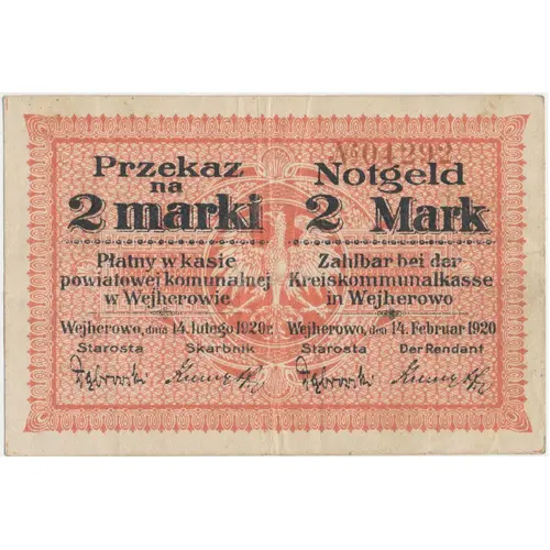 Przekaz na 2 Marki Płatny w kasie powiatowej komunalnej w Wejherowie Wejherowo, dnia 14 lutego 1920r Starosta Skarbnik |
