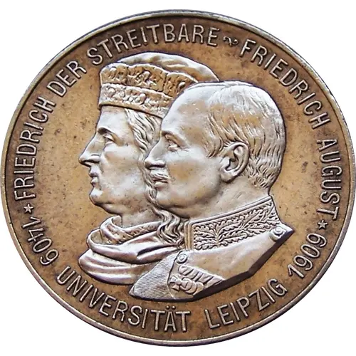 | Obverse lettering | FRIEDRICH DER STREITBARE ~ FRIEDRICH AUGUST * 1409 UNIVERSITÄT LEIPZIG 1909 * |