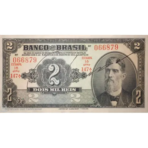 | Obverse lettering | 2 2 BANCO DO BRASIL NA SÉDE DO BANCO DO BRASIL SE PAGARÁ AO PORTADOR DESTA, DE ACCORDO COM A LEI N.4635 A DE 8 DE JANEIRO DE 1923, A QUANTIA DE 2 2 DOIS MIL REIS PRUDENTE DE MORAES AMERICAN BANK NOTE COMPANY. (Translation: Bank of Brazil At the Headquarters of Banco do Brasil will be paid to the holder of this agreement with law no. 4635 a of January 8, 1923, the amount of Two Thousand Reis Prudente de Moraes American Bank Note Company.) |