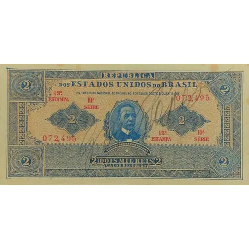 | Obverse lettering | 2 2 REPÚBLICA DOS ESTADOS UNIDOS DO BRASIL NO THESOURO NACIONAL SE PAGARÁ AO PORTADOR DESTA A QUANTIA DE 2 2 2 DOIS MIL RÉIS 2 VALOR RECEBIDO (Translation: Republic of the United States of Brazil At the National Treasury the holder will be paid the amount of Two Thousand Réis Amount received) |