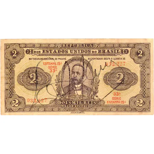 | Obverse lettering | REPUBLICA dos ESTADOS UNIDOS do BRASIL No Thesouro Nacional se pagará - Ao portador desta a quantia de Joaquim Murtinho 2 - DOIS MIL REIS - 2 Valor recebido (Translation: Republic of the United States of Brazil In National Treasury will pay to the Bearer a amount of Joaquim Murtinho Two Thousand Reis Amount Received) |