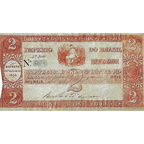 | Obverse lettering | 2 DOIS * 2 * DOIS * 2 * DOIS * 2 * DOIS 2 IMPERIO DO BRASIL Nº ____ 2$000 NO THESOURO NACIONAL SE PA- GARÁ ao portador desta a quantia de DOIS MIL RÉIS, valor recebido. 2 Decreto de 1º de Junho de 1833. 2 * 2 * DOIS * 2 * DOIS * 2 * DOIS * 2 * 2 (Translation: 2 Two Empire of Brazil No. ____ 2$000 At the National Treasury you will pay bearer of this the amount of Two Thousand Réis, amount received. 2 Decree of June 1, 1833. 2 Two) |
