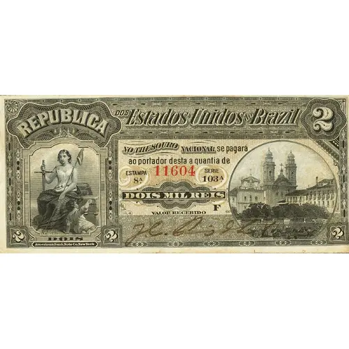 | Obverse lettering | REPUBLICA DOS ESTADOS UNIDOS DO BRAZIL NO THESOURO NACIONAL DE PAGARÁ AO PORTADOR DESTA A QUANTIA DE DOIS MIL REIS VALOR RECEBIDO (Translation: Republic of The United States of Brazil In The National Treasury will pay to the bearer of this amount of Two Thousand Reis Amount received) |