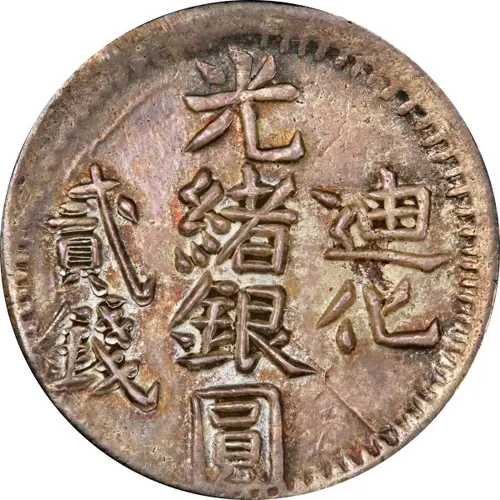 | Opschrift voorzijde | 光 貳緒迪 錢銀化 圓 (Translation: 2 Qian Guangxu (Emperor) / Silver coin Dihua) |