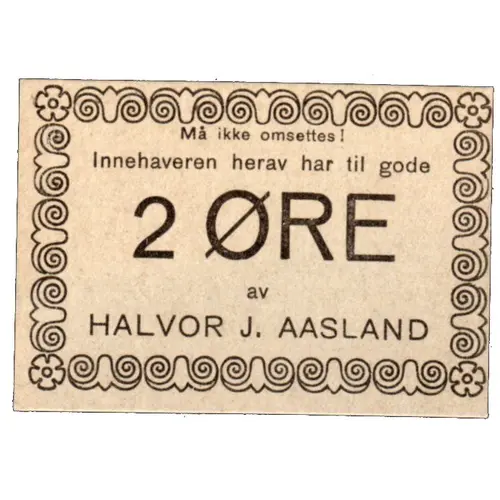 | Chữ khắc mặt trước | Må ikke omsettes! Innehaveren herav har til gode 2 ØRE av HALVOR J. AASLAND |