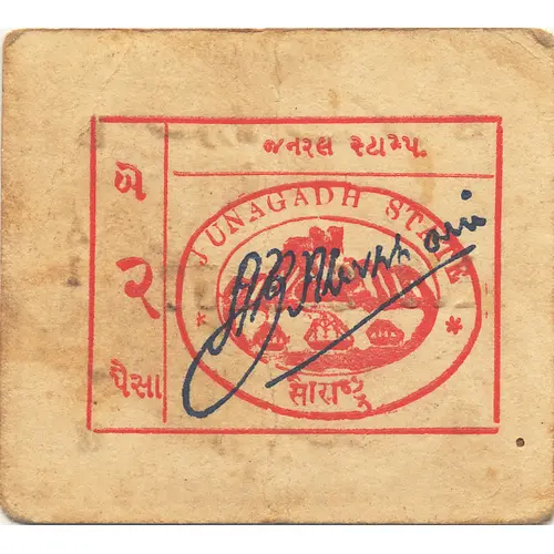 | Obverse description | No date, circa 1943, red, oval seal stamp saying `JUNAGADH STATE` |