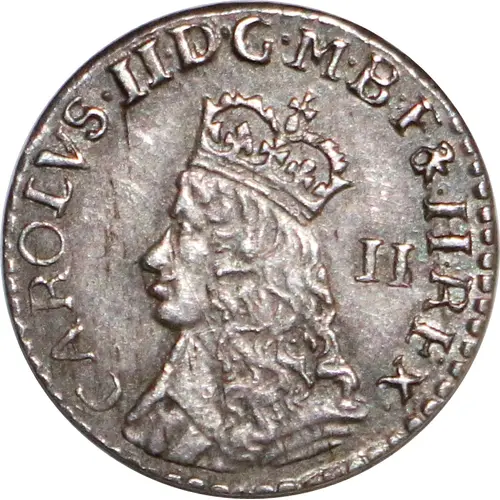 | Obverse description | Crowned bust of King Charles II left to bottom edge of coin, single-arched crown, no inner circle, denomination behind head to right, legend above, outer toothed border both sides. |