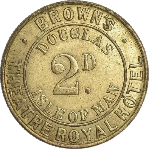 | Obverse lettering | BROWN`S THEATRE ROYAL HOTEL 2D. DOUGLAS ISLE OF MAN |