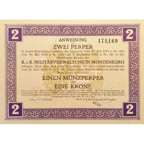 UPUTNICA NA DVA PERPERA u onim uputnicama na državnu blagajnu iz emisije od 25. jula 1914. st. kal. ili 10. maja 1915. st. kal. ili 4. decembra1915 st. kal., koje leže u javnim blagajnama c. i kr. Vojne Uprave u Crnoj Gori. Po vrijednosnom razmjeru utvrđenom u 1. Naredbe Vrhovnog Vojnog Zapovjednika od 16. juna 1916, broj 8 Vjestnika Naredaba, iznaša vrijednost ove uputnice JEDAN ZVEČEĆI PERPER ILI JEDNU KRUNU. Za primanje ove uputnice važe zakonske odredbe o dužnosti primanja perperskih uputnica. Na javnim blagajnama primat će se uplate sa ovom uputnicom po gore označenom vrijednosnom raz- mjeru (3. Naredbe od 10.januara 1917., broj 20 Vjestnika Naredaba i članka II. Naredbe od 29. juna 1917, broj 29 Vjestnika Naredaba). Cetinje, 5. jula 1917 C. i kr. voj. generalni guverner (signature) |