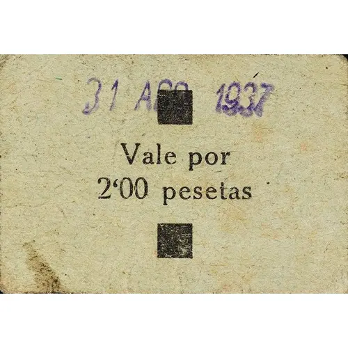 31 AGO 1937 Vale por 2`00 pesetas (Translation: August 31, 1937 Voucher for 2.00 Pesetas) |
