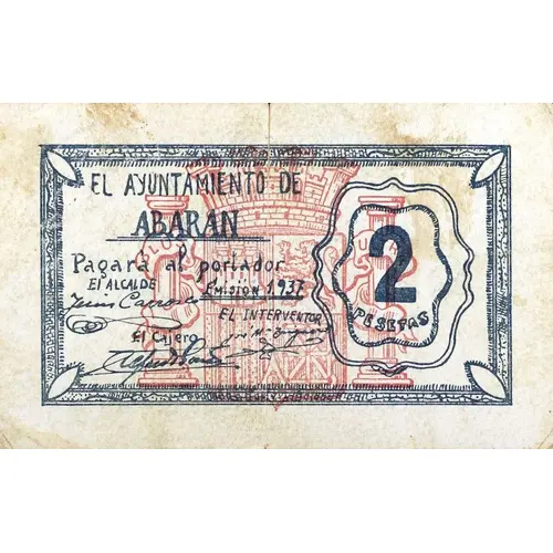 EL AYUNTAMIENTO ABARAN Pagará al portador 2 PESETAS Emisión 1937 (Translation: The City Council of Abarán Will pay the bearer 2 Pesetas Issue 1937) |