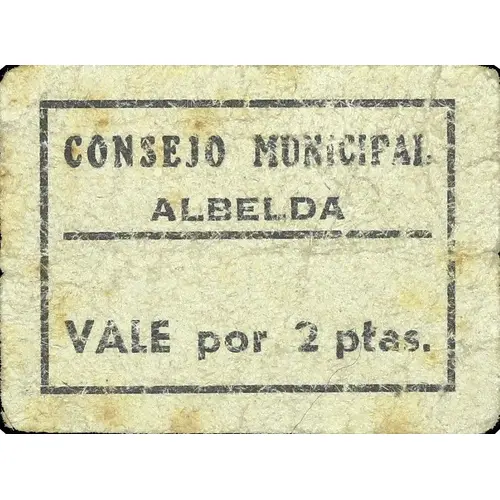 CONSEJO MUNICIPAL ALBELDA VALE por 2 ptas. (Translation: Municipal Council Albelda It`s worth 2 Pesetas) |