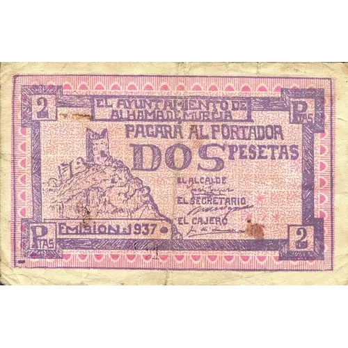 EL AYUNTAMIENTO DE ALHAMA DE MURCIA PAGARÁ AL PORTADOR DOS PESETAS EMISION = 1937 (Translation: The City Council of Alhama de Murcia Will pay the bearer Two Pesetas Issue 1937) |