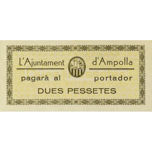 L`Ajuntament d`Ampolla pagarà al portador DUES PESSETES (Translation: The City Council of Ampolla will pay the bearer Two Pesetas) |