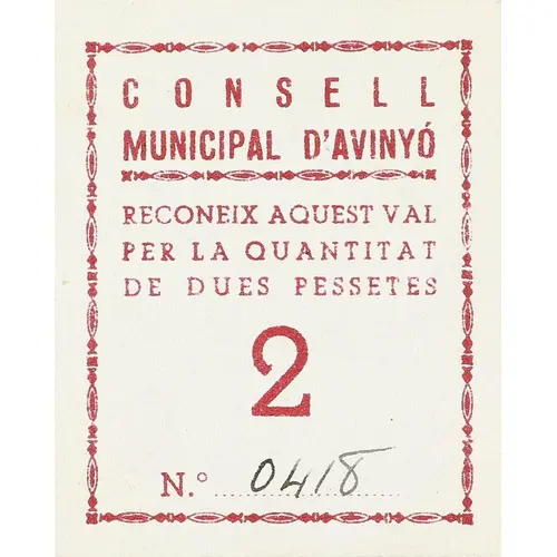 CONSELL MUNICIPAL D`AVINYÓ RECONEIX AQUEST VAL PER LA QUANTITAT DE DUES PESSETES 2 (Translation: Municipal Council of Avinyó Recognize this voucher for the amount of Two Pesetas) |