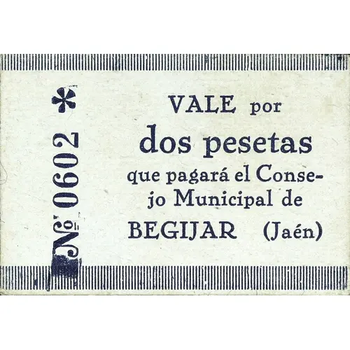 VALE por dos pesetas que pagará el Consejo Municipal de BEGIJAR (Jaén) (Translation: It is worth Two Pesetas paid by the Municipal Council of Begíjar (Jaén)) |