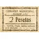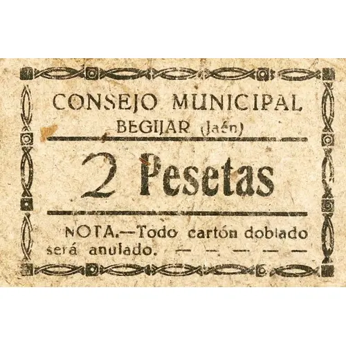 CONSEJO MUNICIPAL BEGIJAR (Jaén) 2 Pesetas NOTA.- Todo cartón doblado será anulado. (Translation: Municipal Council Begíjar (Jaén) 2 Pesetas Note.- Any folded cardboard will be voided.) |
