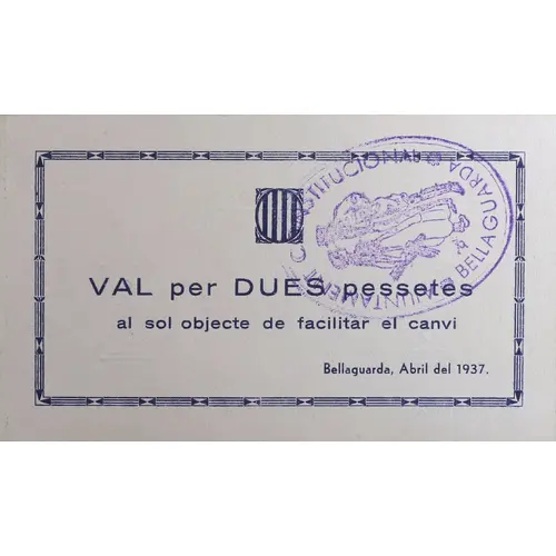 VAL per DUES pessetes al sol objecte de facilitar el canvi Bellaguarda, Abril del 1937. (Translation: Voucher for Two Pesetas with the sole purpose of facilitating change Bellaguarda, April 1937) |