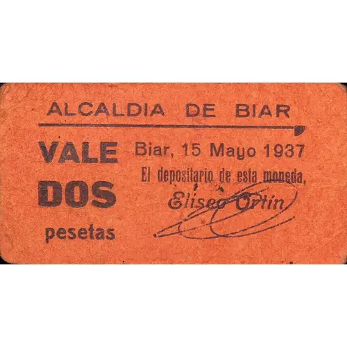 (Translation: Mayoralty of Biar Biar, May 15, 1937 Voucher Two Pesetas The Depositary of this currency,)
