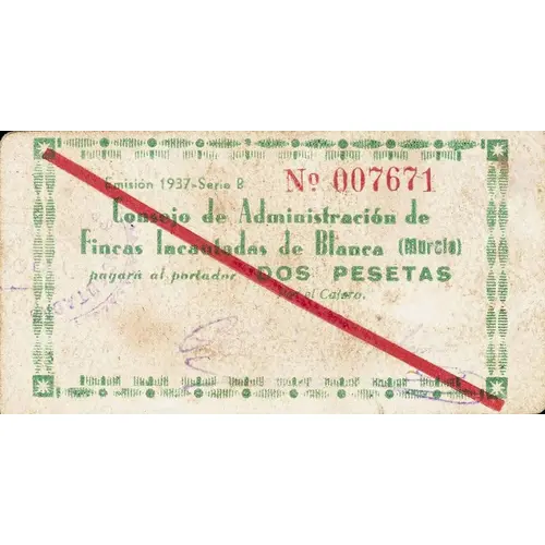 Obverse lettering Emisión 1937 - Serie B Consejo de Administración de Fincas Incautadas de Blanca (Murcia) pagará al portador DOS PESETAS