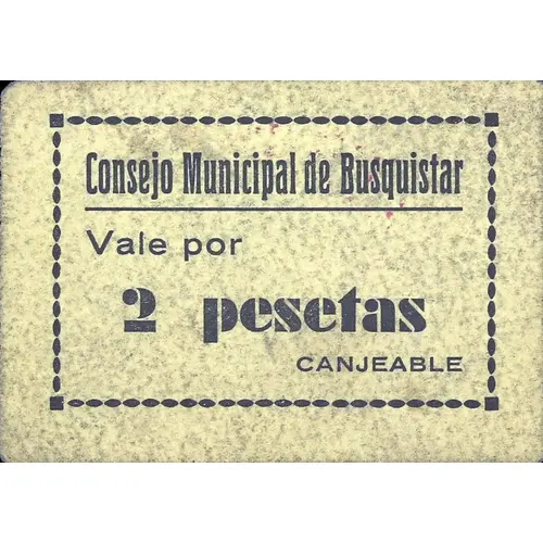 Consejo Municipal de Busquistar Vale por 2 pesetas CANJEABLE (Translation: Municipal Council of Busquistar Valid for 2 Pesetas Redeemable) |