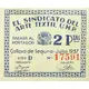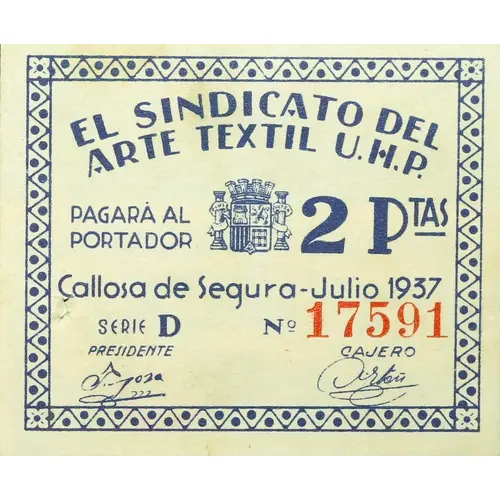 EL SINDICATO DEL ARTE TEXTIL U. H. P. PAGARÁ AL PORTADOR 2 PTAS. Callosa de Segura - Julio 1937 (Translation: The Textile Art Union Will pay the bearer 2 Pesetas Callosa de Segura - July 1937) |
